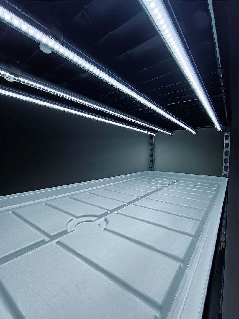- Управление светом: Каждый ярус оснащен стационарным освещением, которое гарантирует равномерное распределение фотонов на каждое растение, исключая зоны тени.