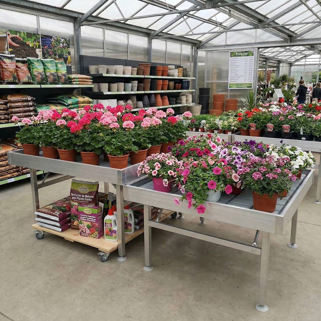 Столы для растений и цветов представляет собой наиболее используемую подcтавку для демонстрации в садовых центрах по всей Европе. В частности, в садовых центрах он находит лучшее применение в теплице  "4 сезона", в области, обычно предназначенной сезонным растениям, таким как герань, сёрфин, цикламен, а также в питомниках, где такие растения, как азалии, рододендроны или буксус, все чаще выставляются на выставочных столах, а не на земле.