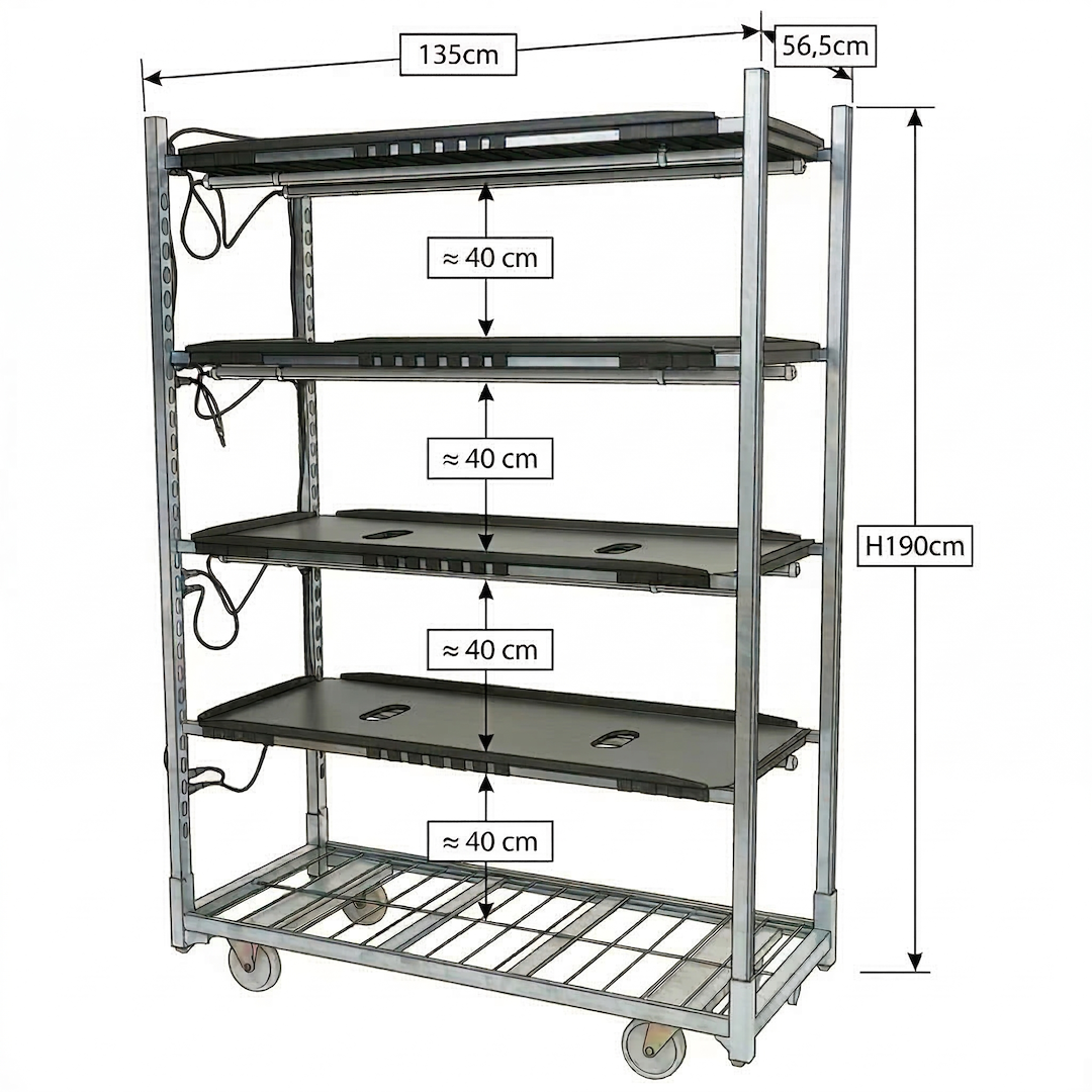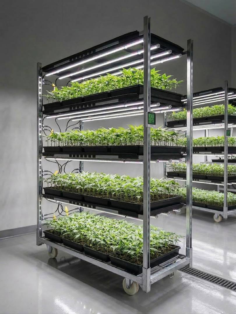 Эта система представляет собой совершенное вертикальное инженерное решение для лабораторий, требующих абсолютной точности. Разработанный для максимизации биомассы в ограниченном пространстве, этот мобильный стеллаж сочетает в себе прочную промышленную конструкцию с зенитным освещением, откалиброванным для критических фаз укоренения и вегетативного развития.